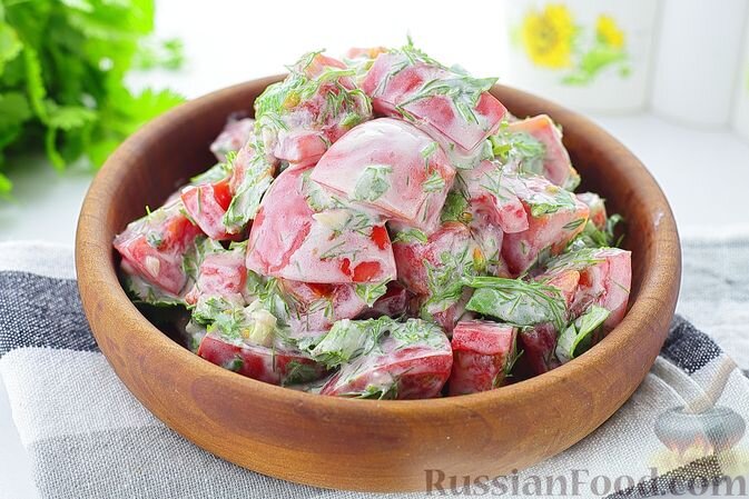 Салат из помидоров с чесноком и зеленью получается сочным и вкусным, особенно если использовать грунтовые помидоры. Свежая зелень и чеснок подчёркивают яркий вкус помидоров и делают блюдо очень гармоничным. В качестве заправки вместо сметаны можно использовать растительное масло или майонез – выбор за вами.