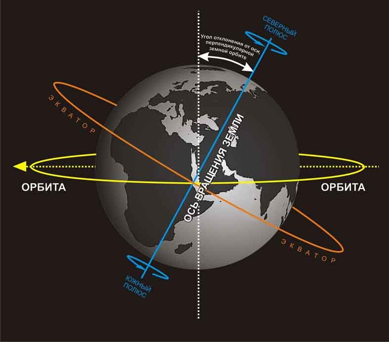 Благодаря наклону земной оси у нас теперь есть чередование сезонов. Когда Северный полюс указывает на Солнце, то в Северном полушарии лето, а в Южном полушарии зима. Когда через 6 месяцев Южный полюс поворачивается к Солнцу, наблюдается обратная ситуация.