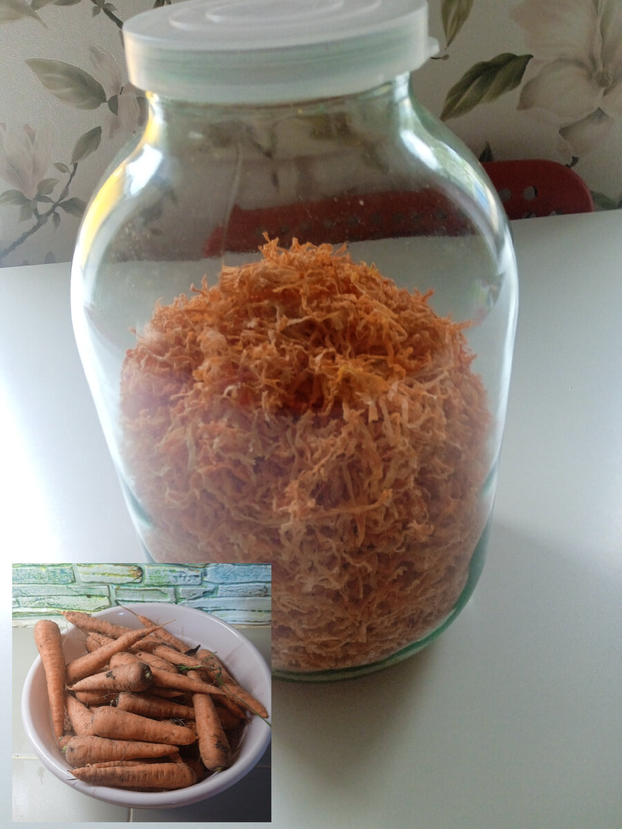 В этом году у меня много моркови а места хранить нет, одна проблема сменяется другой. Я решила испробовать несколько способов. Способ 1 Сушу морковь в сушилке. Сушилка у меня старая мастерица. Сушит недолго главное наложить тонким слоем. Высушила 1 ведро. Из него получилось чуть больше половины 3 л банки. В банку положила 1 ч. лодку соды и лавровый лист и закрыла простой крышкой. Способ 2 Почистила. Нарезала на кружочки. И разложила на свою сушилку для белья. Но прежде застелила марлю и зафиксировала чтоб не попадали. Сушилку поставила в гараж. Там у нас постоянный ветер гуляет. И на улице сейчас пасмурно, холодно но и дожди. Посмотрим будет ли результат. Способ 3 В подполе взяла ящик и смешала морковь с СУХИМ песком и главное раскладывала морковь так чтоб друг с другом не соприкасались. И то не хватило песка пошли дожди а убрать заранее не додумалась. Способ 4 Заморозила в холодильнике, но немного. В этом году места мало хотя 2 морозильника, но полные мясом. (Сами держали кур 7