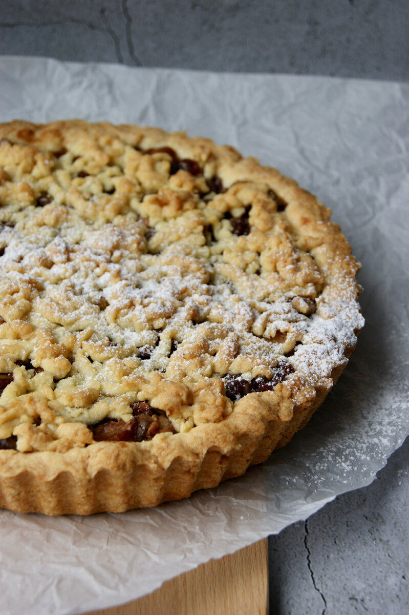 Сделала недавно штрудель, но в новом виде, с песочным тестом, получилось 🔥 Если любите песочные пироги, то очень советую приготовить! Начинка: ▪️ 600 гр. очищенных яблок ▪️ 100 гр. грецких орехов ▪️ 100 гр. изюма ▪️ 2 ч.л. корицы ▪️ 100 гр. сливочного масла ▪️ 150 гр. сахарного песка Яблоки очистить и нарезать на небольшие кубики примерно 2 см. Орехи промыть и порубить, изюм промыть. На горячую сковороду отправить сахарный песок, изюм, орехи, яблоки и корицу. Тушить 5 минут, после чего добавить сливочное масло. Потушить ещё 10 минут. Отправить начинку на сито, чтоб стекла лишняя карамель и начинка была не жидкая. Тесто: ▪️ 210 гр. холодного сливочного масла ▪️ 90 гр. сахарного песка ▪️ 300 гр. муки ▪️ 1 яйцо Масло, сахар и муку порубить вместе любым удобным способом (ножом, в тёрку, в измельчителе). Добавить к общей массе яйцо, и замесить тесто, так чтоб оно собралось в один шар. Если тесто рассыпается, можно добавить 1-2 ст.л. ледяной воды. 1/4 теста отделить и убрать в морозилк