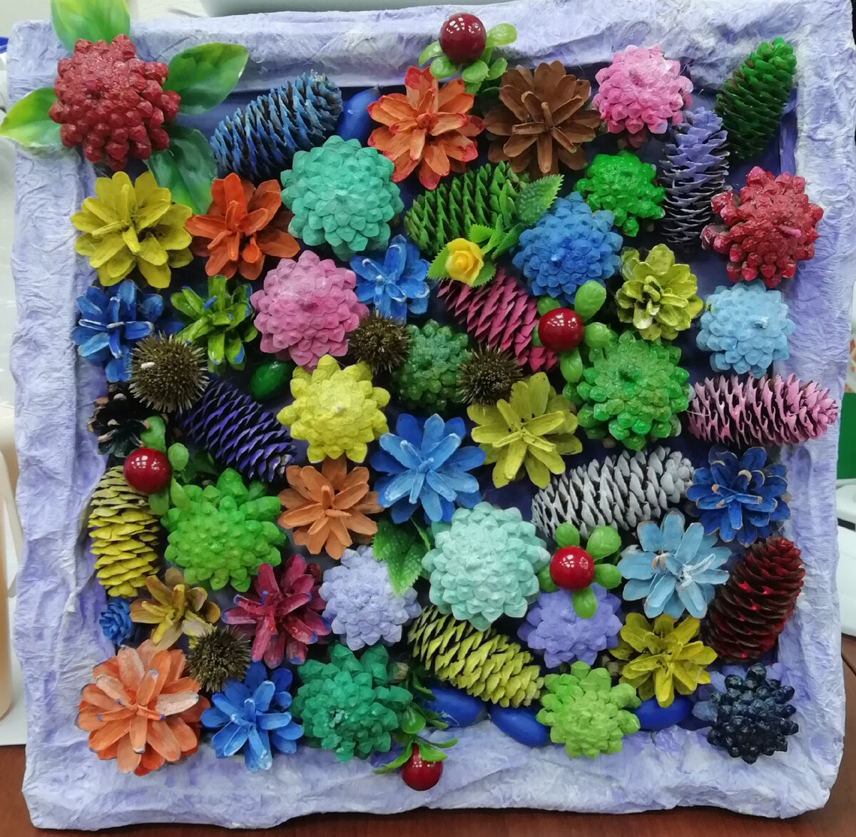 При создании многих своих работ я использую природные материалы такие как: шишки различных хвойных пород дерьев, желуди, цветы, ягоды и т. д. Данная композиция была создана из сосновый шишек. На основе из фанеры, с помощью бумаги и клея ПВА сделала рамку. При высыхании клей даёт твёрдую "лаковую корочку", которой легко можно придать любой понравившийся цветовой оттенок. После покраски и высыхания основы, можно приступить к формированию панно. Шишки можно окрасить любой имеющейся в наличии краской (гуашь, акрил). Я использовала гуашь. Но хочу сразу сказать, что гуашь имеет матовый оттенок и для придания шишкам блеска изделие придётся дополнительно покравать лаком. Окрашенные шишки и дополнительные материалы такие как желуди и сушёные ягоды приклеиваются на термоклей пистолет. Всю пустоту между шишками можно заполнить искусственной зеленью. Вот такая красота у меня получилась. Подписывайтесь на мой канал и оставьте комментарий, если Вам это интересно.