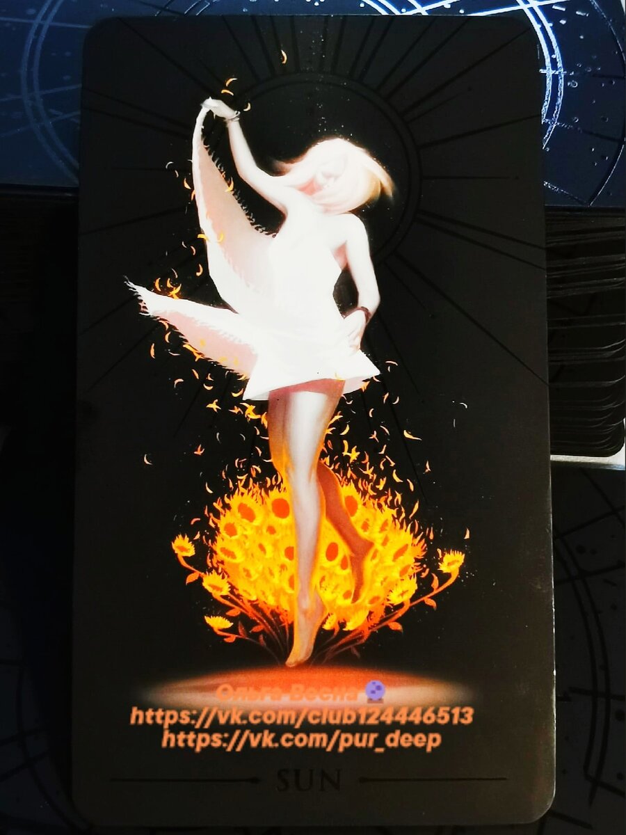 Вы в хорошем жизненном тонусе. Вы целостны и уверены в себе. Карта советует показать миру свою солнечную сторону, напоминает об умении радоваться простым вещам и Вашем внутреннем Свете.
