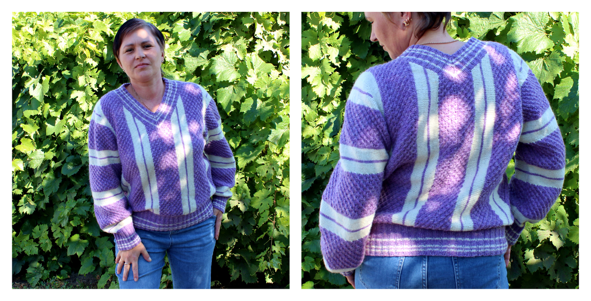 Вяжем деталь до третьего раппорта следующей сиреневой полосы. Всего в детали 92 ряда.