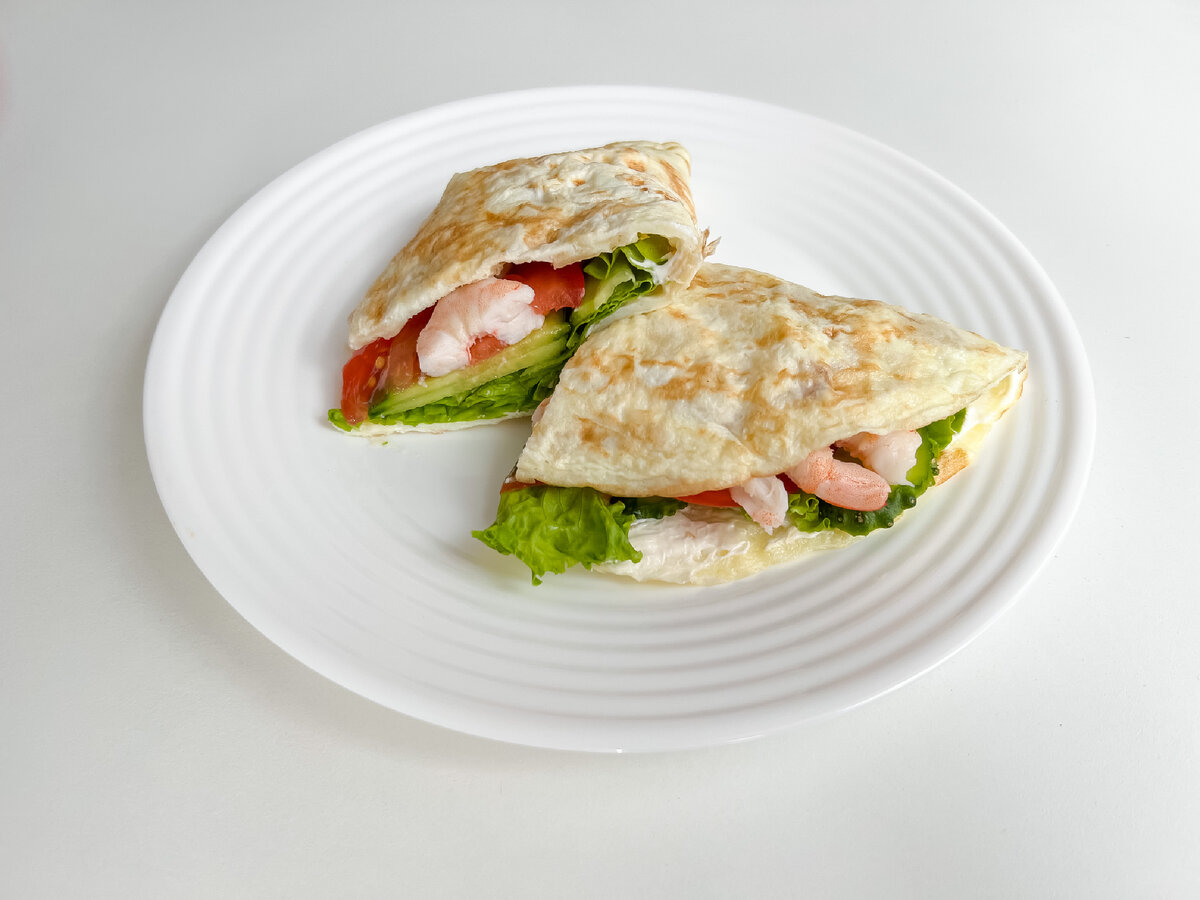 КБЖУ порции: ~ 302 ккал; белки-22 гр; жиры- 16 гр; углеводы- 16 гр. Утром нам зачастую некогда долго стоять у плиты и выдумывать какие-либо блюда, поэтому, этот завтрак идеально подойдёт каждому, в нем соблюдены все главные критерии: быстро, легко, вкусно. Ингредиенты: Лаваш-20 грамм; Яйца-2 шт; Сыр творожный- 20 грамм; Креветки-30 грамм(в очищенном виде); Помидор- 30 грамм; Огурец-30 грамм; Салат-10 грамм; Капля масла; Соль. В первую очередь зачистим креветки, вы можете взять чищенные, я же решила немного усложнить себе задачу. Если креветки у вас королевские, как у меня, помните, что помимо панциря, у них обязательно нужно удалить пищевод, иначе ваше блюдо будет испорчено. После того, как самая грязная работа выполнена, приступим к изготовлению блинчика, для этого измельчаем лаваш, можно нарезать его ножницами, или же просто нарвать руками, как это сделала я. Далее в миску к лавашу разбиваем яйца, добавляем соль и хорошенько все взбалтываем. Теперь можно приступать к изготов