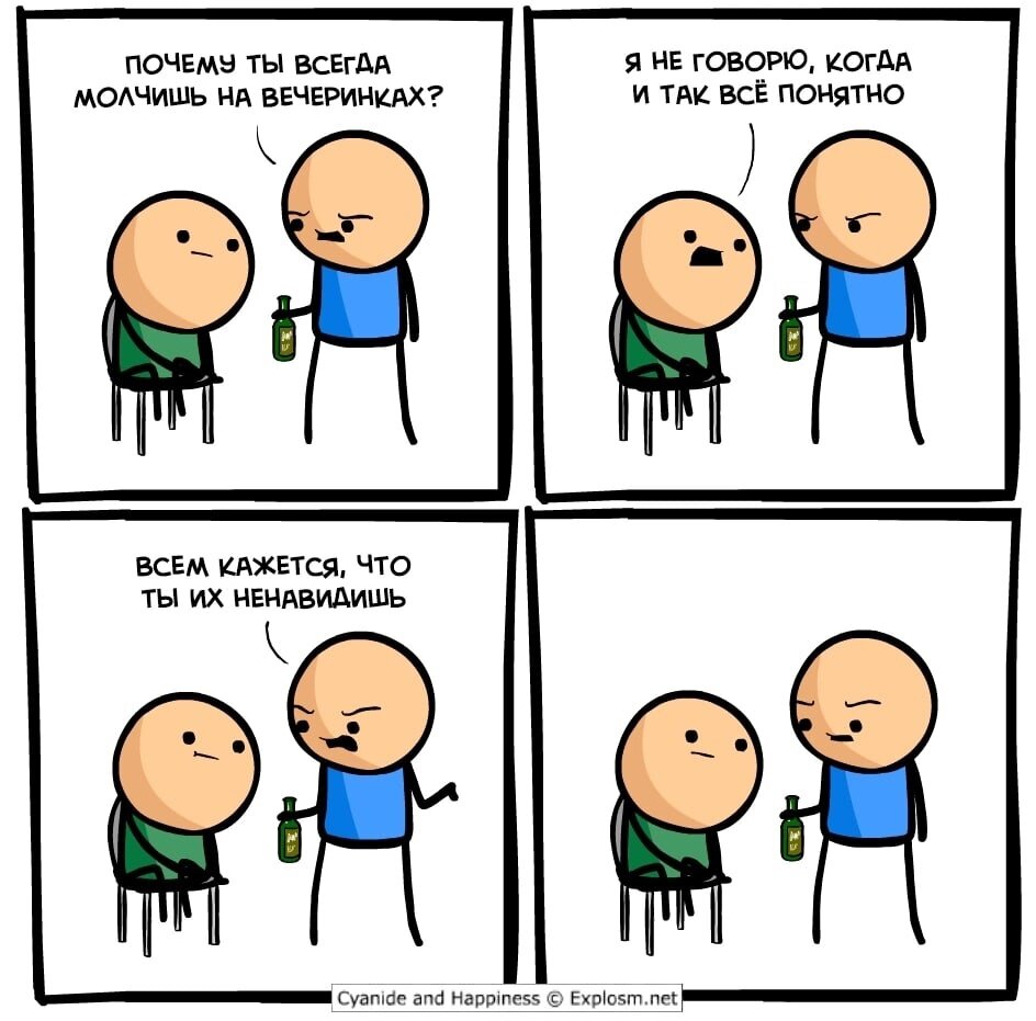 Сегодня пятница, впереди выходные, а значит самое время запланировать приятные встречи с друзьями или даже устроить небольшую вечеринку. И да, сегодняшняя подборка комиксов как раз будет посвящена этой теме. Какие неловкие ситуации могут произойти во время вечеринки с друзьями? Что может помешать веселью? Чем могут обернуться новые знакомства? Обо всем этом - читайте ниже. Надеюсь, что вам понравится. Думаю, что серия комиксов Cyanide and Happiness («Цианид и Счастье») особо не нуждается в представлении. Данный проект, созданный американскими художникам Дэйвом МакЭльфатриком (Dave McElfatrick), Крисом Уилсоном (Kris Wilson), Мэттом Мэлвином (Matt Melvin) и Робом ДенБлэйкером (Rob DenBleyker) является одним из самых популярных веб-комиксов в мире уже на протяжении более чем 15 лет. Ниже - один из более-менее свежих комиксов серии. Московский художник MaximPe рисует комиксы, наполненные абсурдным юмором и игрой слов. Одна из его работ, как мне кажется, особо актуальна в последнее время.