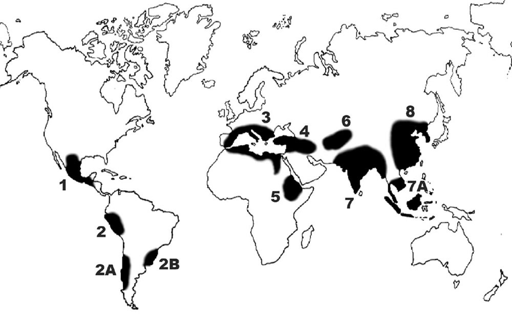 1. Центральноамериканский, 2. Южноамериканский, 3. Средиземноморский, 4. Переднеазиатский, 5. Абиссинский, 6. Среднеазиатский, 7. Индостанский, 7A. Юго-восточноазиатский, 8. Восточноазиатский.