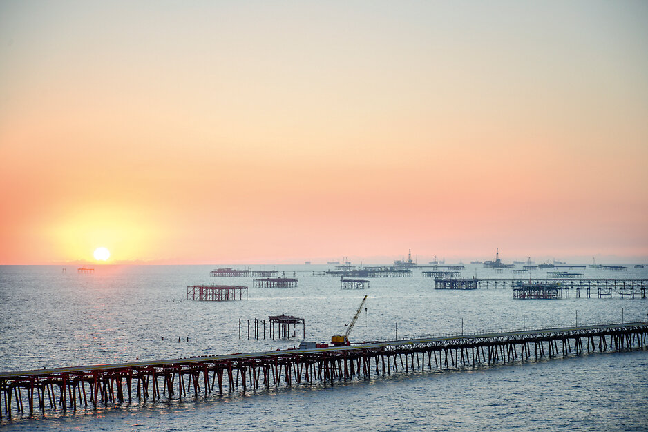 Эстакад всего было выстроено под 500 километров, сейчас осталось 100. Из них половина действует, половина – те, что ведут к замолчавшим скважинам, – потихоньку разрушается. Их убирают, остаются торчать из воды сваи, водолазы отрезают эти сваи, металл вывозят на берег.