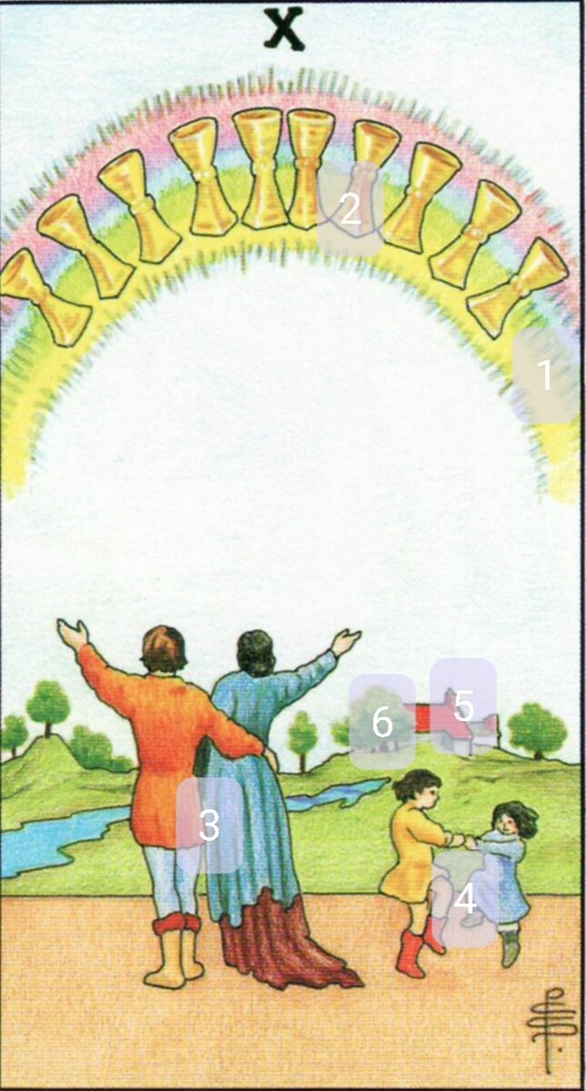 #таро Символика: 1. Радуга - трудности позади. 2. Кубки - мир. 3. Семейная пара - благодарность и совместное счастье. 4. Танцующие дети - беззаботность. 5. Дом - защита. 6. Сад - плодородие. Полный образ: Десятка Кубков символизирует гармонию, счастье, приятное окружение. Гадатель находится среди доброжелательных людей, будь это рабочий коллектив или семья. Что показывает Десятка Кубков: гадатель доволен сложившейся ситуацией, проявляет интерес и дружелюбие к окружающим. Что советует Десятка Кубков: гадателю следует настроиться на доброжелательное общение с людьми, где бы он ни был. Что обещает Десятка Кубков: гадатель будет с удовольствием сотрудничать с другими людьми, возможно, создаст семью.