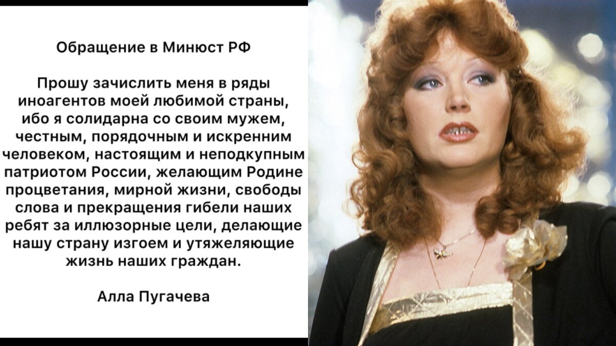 Пост Аллы Пугачёвой с просьбой к Минюсту РФ признать её иноагентом вслед за супругом Максимом Галкиным разделил звёзд на два лагеря. Пока журналистка Ксения Собчак и актриса Юлия Высоцкая благодарят Примадонну за смелую позицию, рэпер Тимати и телеведущий Владимир Соловьёв «хоронят» легендарную певицу. Советская и российская певица Алла Пугачёва впервые высказалась о СВО и обратилась к Минюсту с просьбой признать её иностранным агентом в поддержку супруга Максима Галкина (признан иноагентом в РФ). Примадонна опубликовала пост в личном блоге в инстаграме*. Прошу зачислить меня в ряды иноагентов моей любимой страны, ибо я солидарна с моим мужем, честным, порядочным и искренним человеком, настоящим и неподкупным патриотом России, желающим Родине процветания, мирной жизни, свободы слова и прекращения гибели наших ребят за иллюзорные цели, делающие нашу страну изгоем и утяжеляющие жизнь наших граждан. Звёзды шоу-бизнеса поделились на два лагеря. Аллу Пугачёву открыто поддержали теннисист Ев