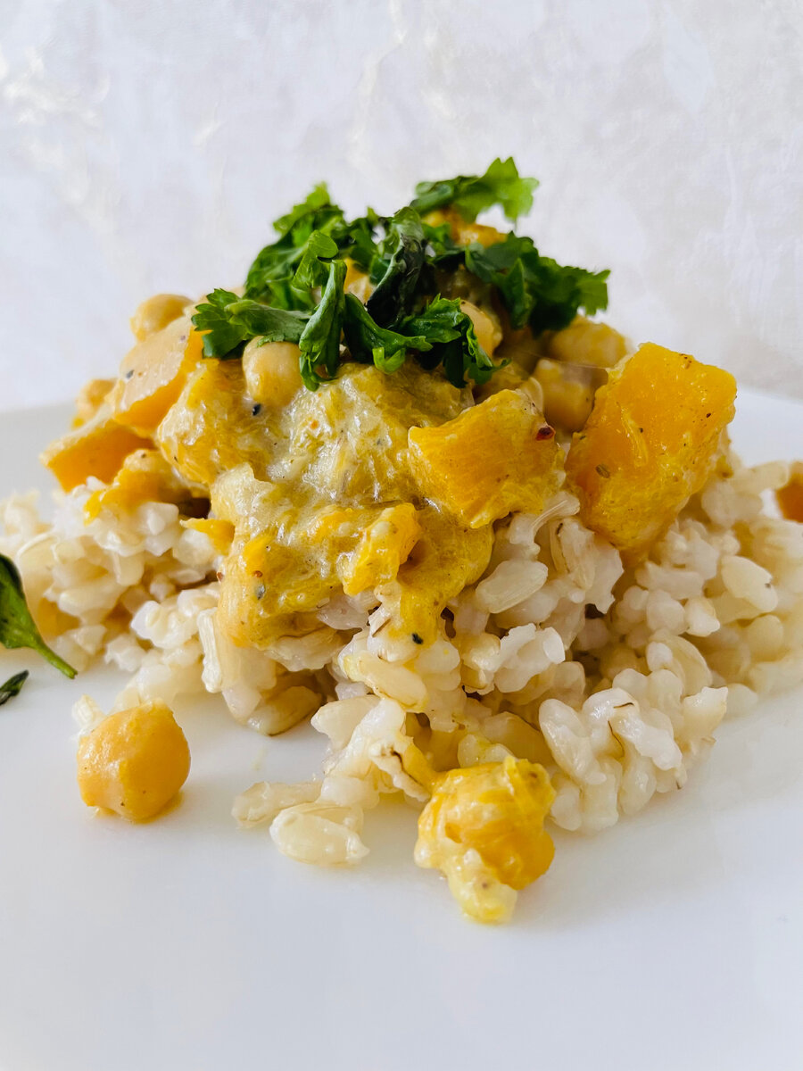 Карри - это не магазин обуви)) Если честно я всегда думала, что это какое-то конкретное блюдо, но нет "карри - это смесь пряностей на основе корня куркумы", так говорит Википедия, а дальше получается можно творить как душе угодно, добавлять любые компоненты (а это я люблю). Поэтому вот моя вариация на тему карри. Ингредиенты: 1/4 шт - Красная луковица (лука можно брать больше я просто его не люблю) 100 гр - Нут сухой 400 гр - Тыква 150 мл - Кокосовые сливки Порошок карри, смесь перцев, кинза по вкусу Масло подсолнечное Процесс: 1. Сначала подготовим нут (хотя можно взять консервированный, он уже готов). 100 гр нута необходимо залить водой и оставить на ночь или на сутки, затем промыть, снова залить водой, добавить немного соды и отварить до готовности. 2. Лук мелко режем и обжариваем на растительном масле до прозрачности. 3. Тыкву моем, чистим, режем кубиком и добавляем к луку (я все делаю в мультиварке на режиме "Выпечка"), обжариваем, а затем тушим до мягкости 4. Заливаем все кокосов