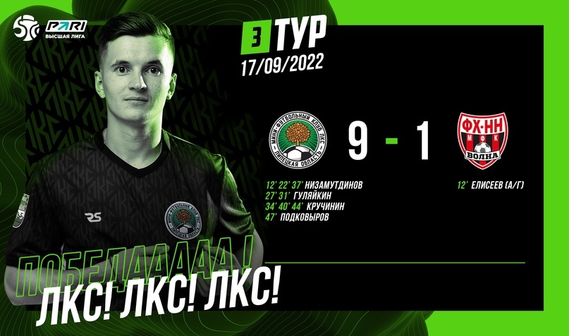 Дебютант PARI – Высшей лиги провёл на равных с липчанами только первый тайм Мини-футбольный клуб ЛКС в 3-м туре PARI – Высшей лиги принимал на домашнем паркете нижегородский «Футбол-Хоккей НН». Команды стартовали по-разному, ЛКС – с домашней победы над «Поморьем» и гостевой ничьей с КПРФ-2, а «Футбол-Хоккей НН» был разгромлен КПРФ-2, но в домашнем матче с дублёрами «Газпром-Югры» взял первое очко, отыгравшись с 0:2. МФК ЛКС (Липецкая область) – МФК «Футбол-Хоккей НН» (Городец) – 9:1 (2:1). PARI – Высшая лига / Первенство России по мини-футболу среди мужских команд / Конференция «Запад» / сезон 2022/23, 3 тур. 17 сентября 2022 года. СК "Атлант" (Липецкий район, Копцевы Хутора, ул. Котовского, 1В). Голы: Елисей Елисеев (а/г) — 12 мин (0:1), Фидан Низамутдинов — 12 мин (1:1), Фидан Низамутдинов — 22 мин (2:1), Денис Гуляйкин — 27 мин (3:1), Денис Гуляйкин — 31 мин (4:1), Олег Кручинин — 34 мин (5:1), Фидан Низамутдинов — 37 мин (6:1), Олег Кручинин — 40 мин (7:1), Олег Кручинин — 44 мин (