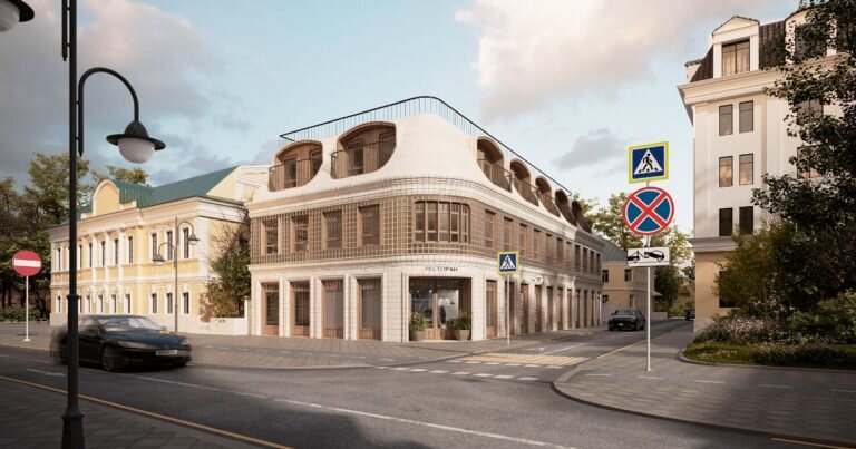 Удивительная компактность здания, выходящего фасадом на Пятницкую улицу, компенсируется внушительным объемом во внутреннем дворе. Сейчас на месте будущей застройки (Пятницкая улица, 40) расположен сквер с можжевельниками и елками, огороженный забором. В ближайшем особняке — офис банка, а вот в соседнем — «Рихтер» с его великолепным двором-садом. С одной стороны фасад дома будет выходить на Пятницкую улицу, с другой — в Голиковский переулок. Дом будет едва ли выше, чем соседнее здание, а вот мансардный этаж получится куда более выразительным — с характерными круглыми балконами. Кроме того, видно, что крышу хотят сделать эксплуатируемой — там может разместиться, например, веранда ресторана, который может открыться на первом этаже. А вот во внутреннем дворе будет спрятано четырехэтажное офисное здание. У него архитектура уже совсем другая — более современная и строгая, с прямоугольными окнами в пол. По всему видно, что здание с круглыми балконами старается быть похожим на соседние, но во