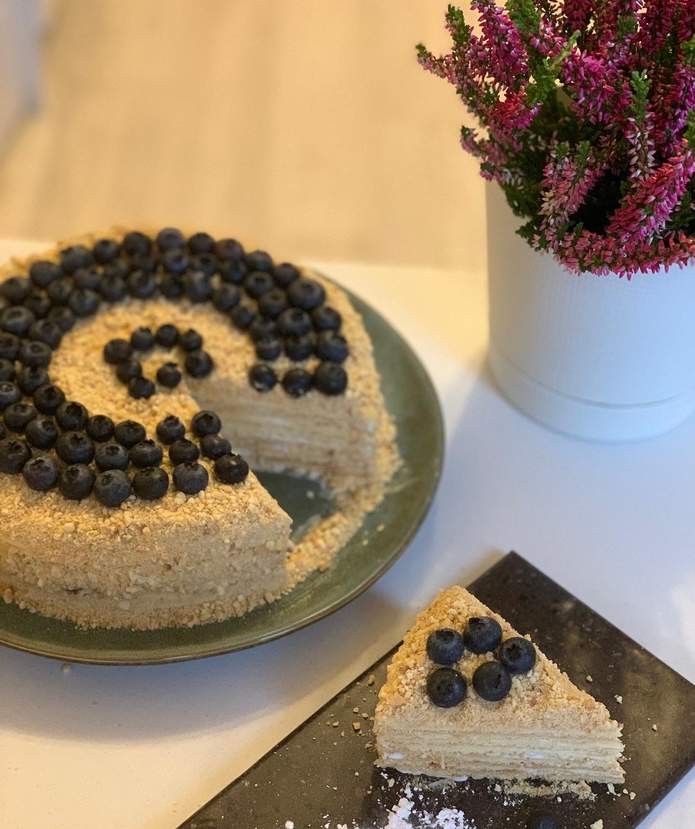 Вам понадобиться: 500 г. Муки 100г. Сливочного масла 200 г. Сахара 2 ст. л. мёда 1 яйцо 1 ч.л ю. Соды _•_•_•_•_•_• _•_•_•_•_•_• 300 г. Сметаны 150 г. Творожного сыра 150 г. Сахар пудру