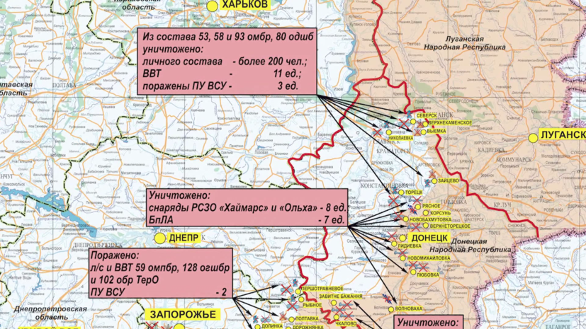 В Минобороны России заявили, что российская авиация высокоточным оружием уничтожила в ДНР за сутки 200 украинских военных. «В течение суток высокоточным оружием ВКС нанесены удары по местам сосредоточения живой силы и военной техники 53-й, 58-й, 93-й механизированных бригад... а также 80-й десантно-штурмовой бригады... Уничтожены более 200 украинских военнослужащих и 11 единиц бронетехники», — заявили в ведомстве. Также уточняется, что удар был нанесён ещё и по скоплению живой силы и техники 46-й аэромобильной бригады Украины в районе села Белогорка Херсонской области. В результате уничтожены три единицы бронетехники и до 15 украинских военнослужащих. 14 сентября в Минобороны России заявили, что российская авиация уничтожила в ДНР до 250 украинских военных ударами высокоточного оружия.