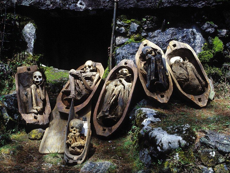 В мире существует бесчисленное количество традиций и ритуалов по захоронению умерших. Некоторые нам понятны, некоторые вызываю недоумение, но есть и такие которые кажутся нам странными. Одним из таких странных обычаев может показаться ритуал на Филлипинах. Поселение инибалои из покон веков мумифицировали умерших, они делали для своих усопших маленькие короба-гробики, размер которых позволял разместить тела в позе эмбриона. Вроде не чего из ряда вон выходящего, много народов мира прибегали к мумификации, но в действиях инибалои есть свои особенности. В связи с тем, что территория поселения располагалась в горах Кордильерах, инибалои были отрезаны от цивилизации. Благодаря этому у них по сей день сохранились древние традиции. В начале прошлого века леса рядом с поселениями подверглись вырубке. При работах на склонах в труднодоступных горных пещерах были обнаружены древние захоронения. Они представляли собой склад маленьких гробиков с хорошо сохранившимися мумиями внутри. К сожаление т