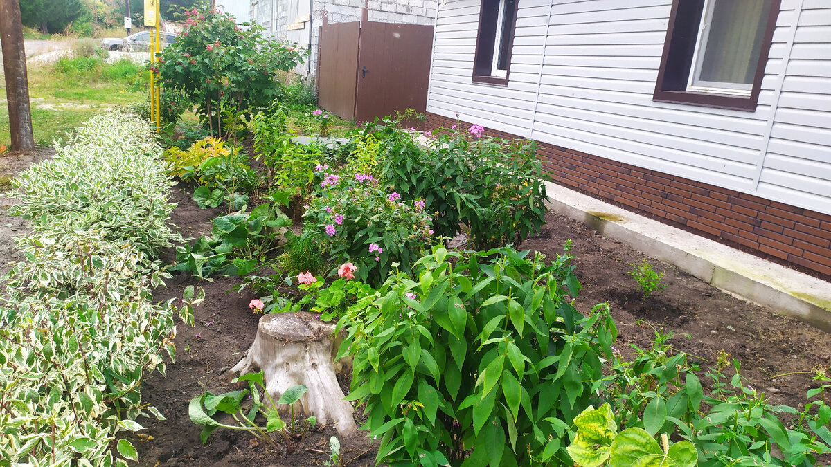 На улице тепло, но пасмурно. Кажется, что небо придавило, сплющило прослойку воздуха своей серой массой. Все застыло, нет даже ветерка. Только странные белёсые мошки летают. Заполонили собой все пространство. Какое-то неприятное ощущение тягучего, как резина, безвременья. Я приехала утром, выпустила котана на улицу и сразу же сама отправилась во двор. Купила в питомнике декоративные кустарники, нужно их высадить в палисадник. Палисадник у меня теперь будет состоять полностью из многолетников и декоративных кустов. Решила отказаться от космеи (она на этой почве безбожно жирует), от мальвы (нынче подвела меня, заразившись ржавчиной) и от однолетников - они просто ни к чему, разве что кое-где уплотнить посадки. Теперь мой палисадник будет выглядеть так: Первая линия - бордюр из дерена. Кустики уже сомкнулись, но ещё выглядят неравномерно и не очень опрятно. Надеюсь, в будущем году, благодаря постоянной стрижке, я доведу-таки его до ума. Сейчас его тоже нужно постричь и больше уже не тро