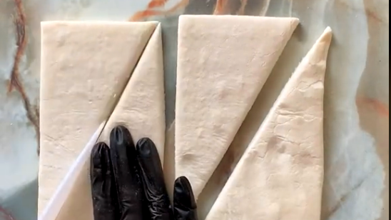 Приготовленный дома круассан по своей хрустящести не сравнится с магазинными.🛒 Когда приготовите сразу, поймете разницу и перестанете покупать их.👍Тем более что готовятся они не дольше 30 минут. Что потребуется:📌 Приготовление:👨🍳 1. На чистый стол посыпьте немного муки и выложите 1 пласт слоеного теста. Я взял бездрожжевое, но можно и дрожжевое. Тут зависит от ваших предпочтений.🧐 2. Если тесто слишком толстое, то раскатайте его при помощи скалки🥖 до толщины 0.3-0.5 см. 3. Острым ножом🔪 разрежьте тесто на 4 треугольника. Что бы получились треугольники📐, вначале режем пополам, а затем каждую половинку по диагонали. 4. Снизу каждого треугольника (по центру) сделайте надрез в 2 см. 5. Возьмите дольку вашего любимого шоколада 🍫 и положите на основание треугольника (выше разреза). Как на фото. 6. И взяв тесто за "ушки" начинайте сворачивать круассан. В итоге у вас получатся примерно вот такие "булочки"🥐 7. Противень застелите пергаментной бумагой и на нее выложите круассаны. 8