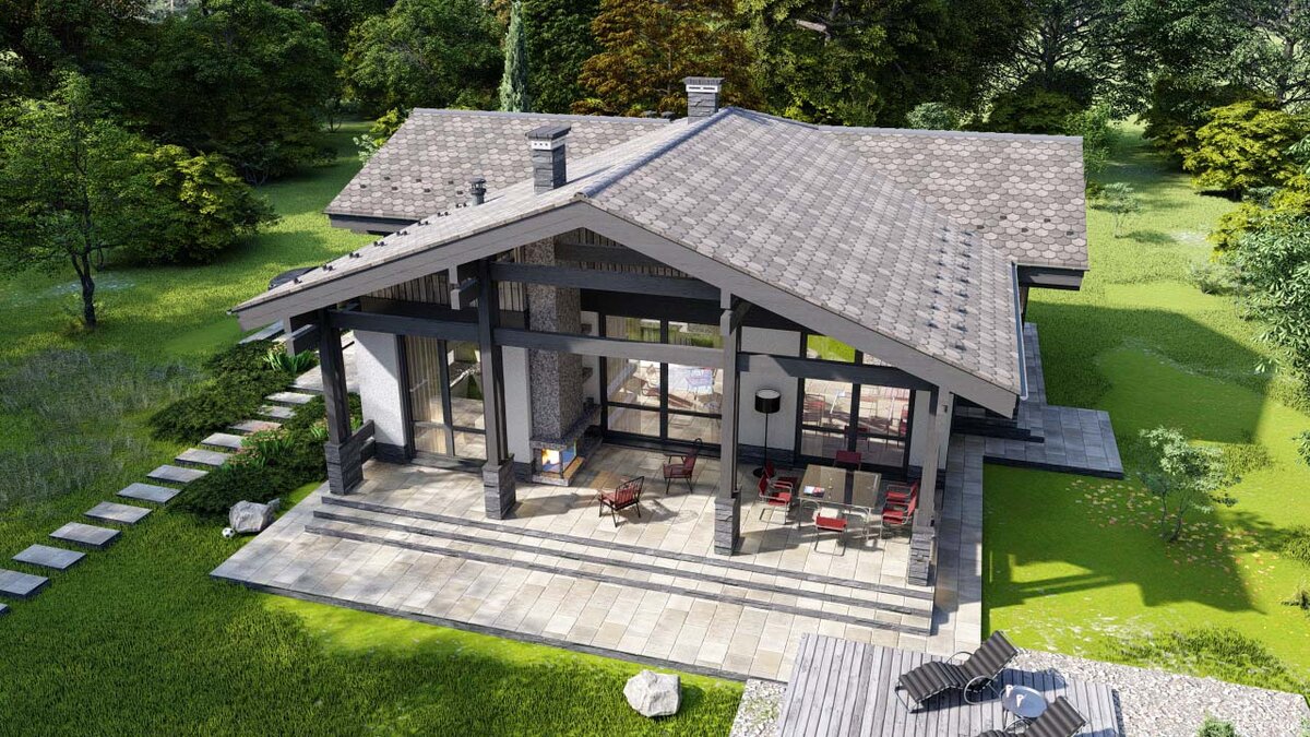Это проект просторного одноэтажного дома 150 м2 в стиле шале, с 3 спальнями, гостиной-лофт, изолированной кухней и просторной террасой Дом предназначен для строительства в глубине участка, или левым краем к дороге. 👇 Ещё несколько домов для строительства в глубине участка Главный фасад - садовый, с большой высокой террасой, оформленной эффектными двойными колоннами, и мощными балками кровли. На террасе можно установить камин, и проводить перед ним синие вечера. Боковые и обратный фасады оформлены проще. 👇 Описание стиля шале и подборка проектов Основа дома - гостиная с камином. Панорамные окна открывают обзор на террасу и сад. Терраса практически продолжает пространство гостиной. Выйти на неё можно и из кухни. Кухня изолированная, ближе ко входу в дом. Между прихожей и кухней - кладовка, которую можно использовать для кухонного хозяйства или сезонной одежды. У раковины - небольшое окошко. Для утешения тех, кто совсем не любит мыть посуду :) 👇 Другие проекты одноэтажников с изолиров