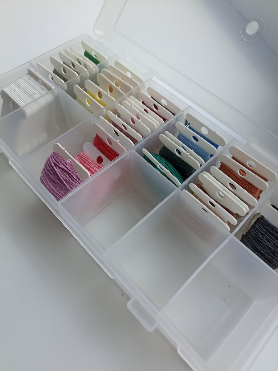 Долго решалась на покупку коробки для ниток с бобинами. Но, разложив всё убеждена, что это было хорошее решение. 1. Все нитки разложены аккуратно по бобинам. Не запутываются, когда вышиваешь. 2. Подбирать цвета удобно. 3. Можно сразу понять каких ниток не хватает и докупить. 4. Коробку удобно перевозить. Ничего не вывалится и не потеряется. Преимуществ много. Рекомендую. Единственное, если вы вышиваете много, берите несколько или сразу побольше. У меня уже всё ниточки не умещаются в одну и я задумываюсь над покупкой второй.