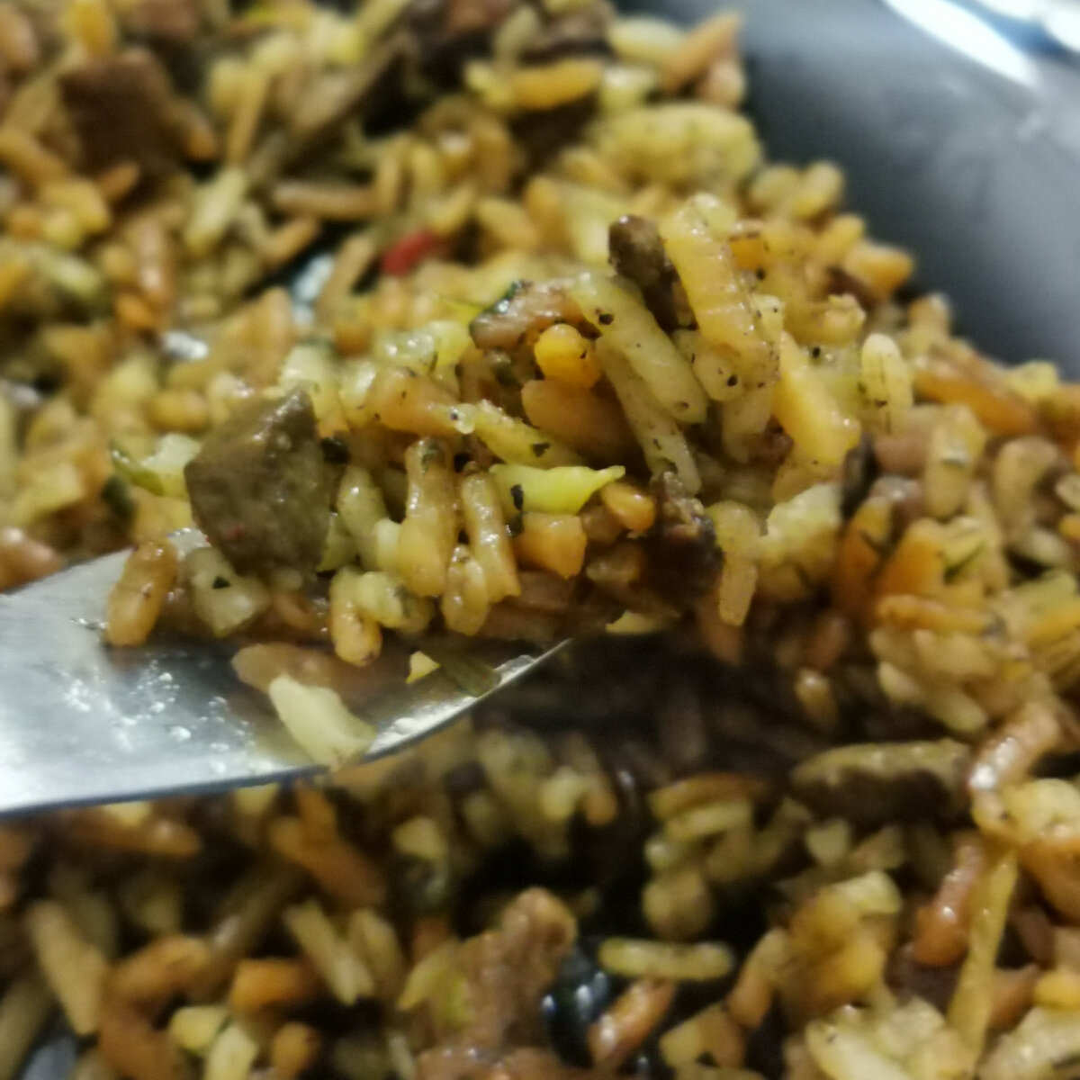 История такая. С блюдом под названием плов у меня, давно и серьёзно, строятся отношения, основанные на взаимном уважении. Ферганский, ташкентский, самаркандский, все они шикарны и все, более или менее похожи. Есть же плов бухарский(тут важно правильно поставить ударение) Готовили его не бухари, а вполне себе порядочные(или нет) евреи проживающие в городе Бухара. И готовили они его в мешках. К казану они обратились много позже. Так что же это за бухарский плов? Сразу скажу, в нем нет зиры, барбариса, моркови, и чеснока. Те, кто дочитал до этого момента, не сказав "тьфу, б..." красавцы. Бахш это мясо, печень, курдючный жир, рис и оооочееь много зелени))) большая часть - кинза. Скажем зелень и рис должны быть в равном количестве. (у меня вчера зелени было поменьше) Всё в бахш режется мелко. Порядок добавления компонентов такой: Сначала в казан, в раскаленное масло запускаем мясо, следом, когда мясо побелеет, печень (перед нарезкой её можно слегка приварить в кипятке, так удобнее буде