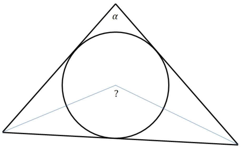Добрый вечер! Сегодня мы докажем свойство, которое не особо популярно в школьной математике. Однако это свойство иногда помогает решить непростые задачи. Итак, начнем. Дан треугольник и окружность, в него вписанная. Известен один из углов. (На рисунке он обозначен за альфа) Надо найти угол, изображенный на рисунке "?". Первое, что нужно вспомнить, центр окружности, вписанной в треугольник - точка пересечения биссектрис этого треугольника. Обозначим остальные два угла за бета и гамма. Сумма альфа, бета и гамма равна 180°. Тогда ½α + ½β + ½γ = 90°. Рассмотрим треугольник, две стороны которого выделены синим цветом. Используя выше полученное выражение, получим, что "?" = 90 + α/2. Вот такое вот свойство. Надеюсь, оно поможет вам решать некоторые задачи. До следующих разборов!