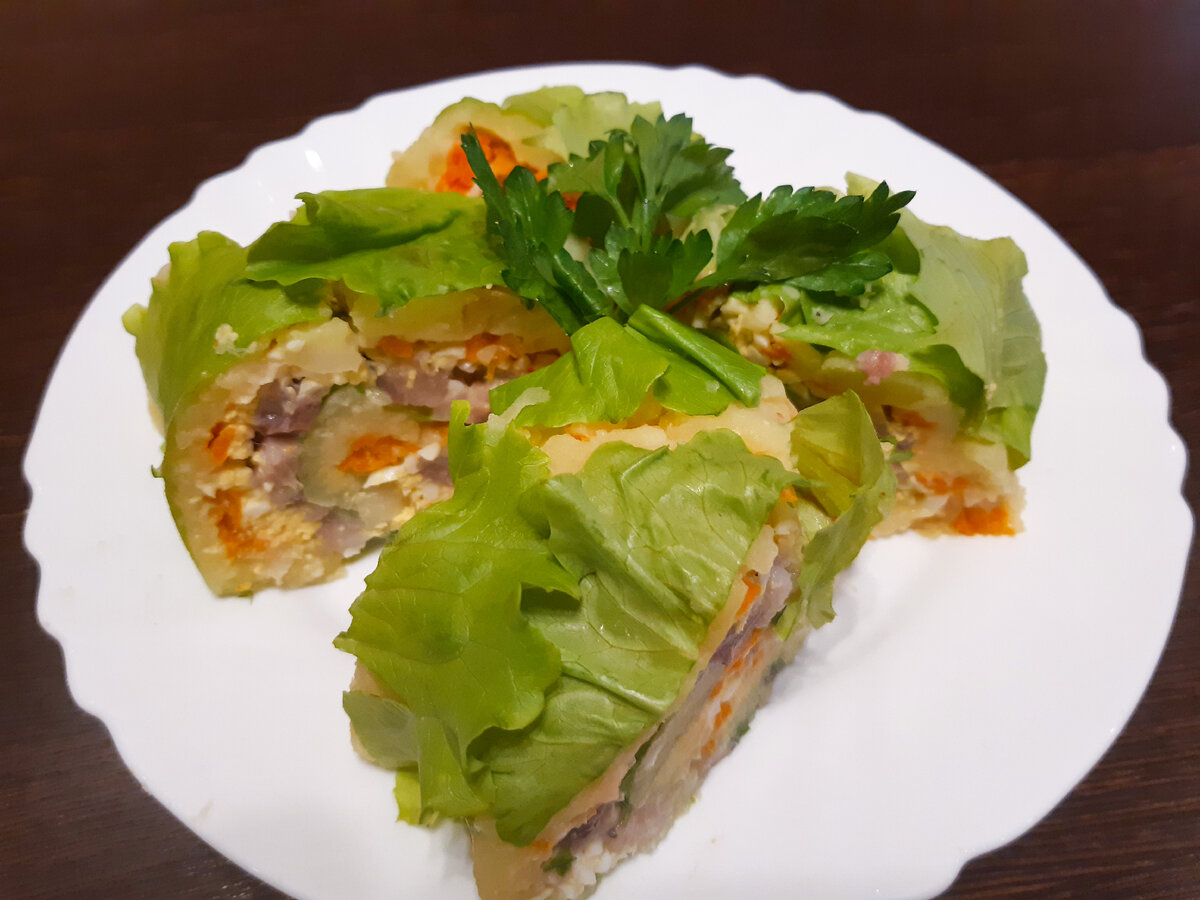 Картофель отварной – 3-4 шт. Морковь отварная – 1-2 шт. Яйца куриные – 2-3 шт. Селёдка – 250 г Лук – 1 головка Салат листовой – 20 г Майонез – 2 ст. ложки Соль, сахар, перец – по вкусу Уксус 9% - 1 чайная ложка Приготовление: 1. На пищевую плёнку выложить внахлёст листья салата. 2. Лук мелко нарезать, посолить, добавить сахар и уксус. Оставить на 10-15 минут. 3. Картофель размять вилкой или натереть на крупной тёрке, выложить поверх листьев салата, смазать майонезом. 4. Поверх картофеля выложить лук. 5. Морковь натереть на крупной тёрке, выложить поверх лука, смазать майонезом. 6. Яйца, отваренные вкрутую, натереть на тёрке, выложить поверх моркови. 7. Селёдку отделить от кости, нарезать мелкими кубиками, выложить следующим слоем. 8. Аккуратно свернуть рулет, убрать в холодильник на 30 минут. 9. Снять с рулета плёнку, нарезать колечками.