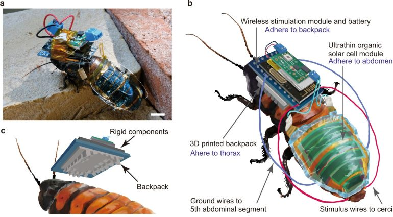 Исследователи из центра изучения новых материй CEMS, находящегося в Японии, использовали 3D печать для создания устройства, которое превращает насекомых в управляемых киборгов. Напечатанный из эластичного полимера крошечный рюкзак, способный облегать покров насекомого, содержит в себе модуль управления и солнечный элемент. Модуль управления может воздействовать на церки тараканов, тем самым заставляя насекомое двигаться в том или ином направлении. "Главное - поддержка заряда батареи. Никто не будет рад увидеть толпу хаотично бегающих тараканов-киборгов. Хотя и возможно построить станции подзарядки, необходимость возвращаться на базу плохо скажется на выполнении задач. Таким образом, наилучшим решением стало размещение "на борту" таракана солнечного элемента." - рассказывает об исследовании ученый Масатака Сасабе. Ученые CEMS считают, что у подобных разработок есть огромный потенциал. Теоретически, подобные киборги могут использоваться в местах, где человеку слишком опасно находиться, л