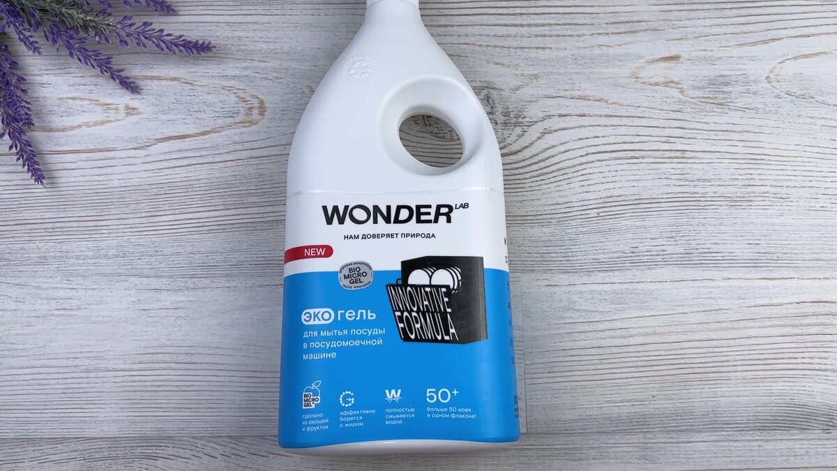 Это просто находка. Почему я только сейчас начала пользоваться экогелем. Экогель стоит намного дешевле, моет ничуть не хуже привычных таблеток и лучше смывается. Ни жира, ни запаха, ни налета у вас не останется! Проверено. Одного флакона хватит, чтобы загрузить больше 50 раз. Гель для мытья посуды в посудомоечных машинах WONDER LAB — это универсальное концентрированное средство для посуды и столовых приборов в посудомоечных машинах любого типа. Гель полностью смывается водой, безопасен и для мытья детской посуды. На посуде нет мыльного налета. Смываемости помогает инновационный компонент Biomicrogel из яблочного жмыха, свекольного жома и кукурузы. Посуда очень хорошо очищается, даже если у вас жирная посуда, можете не переживать. После таблеток посуда пахнет, а после экогеля нет. Никакой «химии». Запаха вообще никакого нет. Для меня это очень важно. Прекрасный состав: Вода >30%, микрогели полисахаридов (Biomicrogel®) 5-15%, НПАВ (на основе натурального пальмоядрового масла) <5%, энзимы