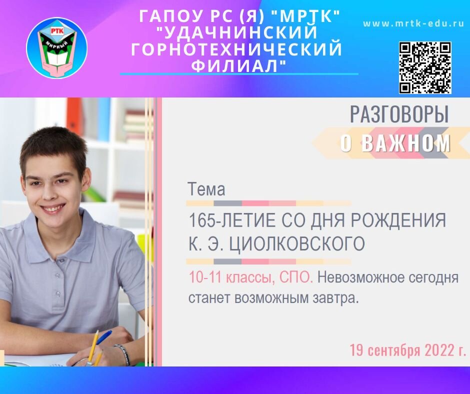 «Разговоры о важном» в Удачнинском горнотехническом филиале: «Я хочу привести вас в восторг от созерцания Вселенной». 19 сентября 2022 г. в продолжение цикла бесед «Разговоры о важном» в студенческих группах кураторами были проведены кураторские часы, посвященные 165 годовщине со дня рождения К.Э.Циолковского. Студенты посмотрели видеоролик, который рассказывает о важнейших открытиях Циолковского в мире космоса, его жизни и деятельности как учёного и изобретателя. Благодаря представленным материалам, обучающиеся совершили путешествие, узнав о достижениях нашей страны в освоении космоса. При выполнении интерактивного задания ребята узнали новые интересные факты об освоении космических вершин. Участники мероприятия пришли к выводу, что для достижения поставленных целей необходимо иметь четкое представление чего хочешь и целенаправленно идти к намеченному, развивая целеустремленность, изобретательность, творчество. Татьяна Баранова, заместитель заведующей по УВР. Пресс-служба ГАПОУ РС (Я