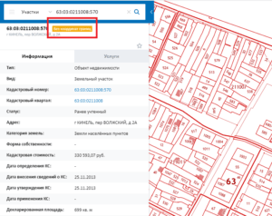 После нажатия кнопки «Найти» появится таблица с основными характеристиками участка (КН, адресом, категории земель, стоимости, площади). На ПКК возникнет план данного участка, закрашенный желтым цветом.