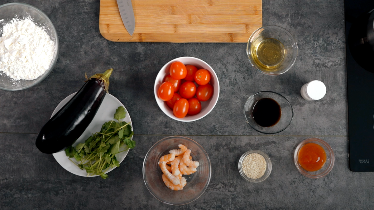 Разнообразьте вкусы этой осени с помощью нашего рецепта азиатского салата с карамелизированными баклажанами. Нежные овощи с хрустящей корочкой и обжаренные креветки в пикантном соусе — то, что обязательно нужно попробовать в этом месяце. Обещаем: готовить такой салат очень просто. Для приготовления изысканного салата из баклажанов вам понадобится: Картофельный крахмал — 100 г Баклажан — 1 шт. Креветки — 300 г Томаты черри — 300 г Кунжут — 50 г Растительное масло — 300 мл Кинза Сладкий соус чили Соевый соус Кунжутное масло Шаг 1: заготавливаем баклажан Первый этап – это подготовка баклажана для будущего салата. Для начала возьмите баклажан и очистите его от кожи. Затем нарежьте овощ кубиками и опустите в ёмкость с подсоленной водой, чтобы он не горчил. Сверху поместите пресс (можно использовать глубокую тарелку), после чего отложите баклажан в сторону — он успеет прекрасно просолиться, пока вы готовите соус. Шаг 2: делаем соус и подготавливаем томаты Здесь всё очень просто.