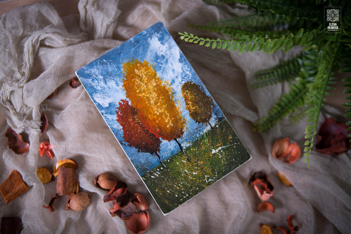 Предлагаю вашему вниманию пошаговый мастер-класс по декору короба “Осень в лесу”. В этом уроке я покажу как можно быстро нарисовать осенний пейзаж и сделать милую работу в стиле “наив”. Рисуем осень! Для работы нам понадобится: Я взяла заготовку «спичечный коробок» из фанеры. Внутренний ящик покрыла пропиткой цвета «Мокко». Ей же обработала внутреннюю поверхность основы. После этого залакировала матовым лаком и высушила. Боковинки заклеила малярным скотчем. Карандашом наметила схему рисунка. Рисую акриловыми красками. Поверхность не грунтовала. Голубым цветом закрашиваю область неба. Краску наношу жирненько, чтобы была возможность смешивать цвета и создавать фактуру прямо на работе. Края неба прорабатываю более темным цветом. Влажной салфеткой тамповочными движениями растушевываю соединение цветов. Мастихином наношу белую краску. Краску набираю в небольшом количестве на обратную сторону мастихина. Наносим легкими движениями. Мы формируем облака и придаем объем нашему небу. Нижнюю час