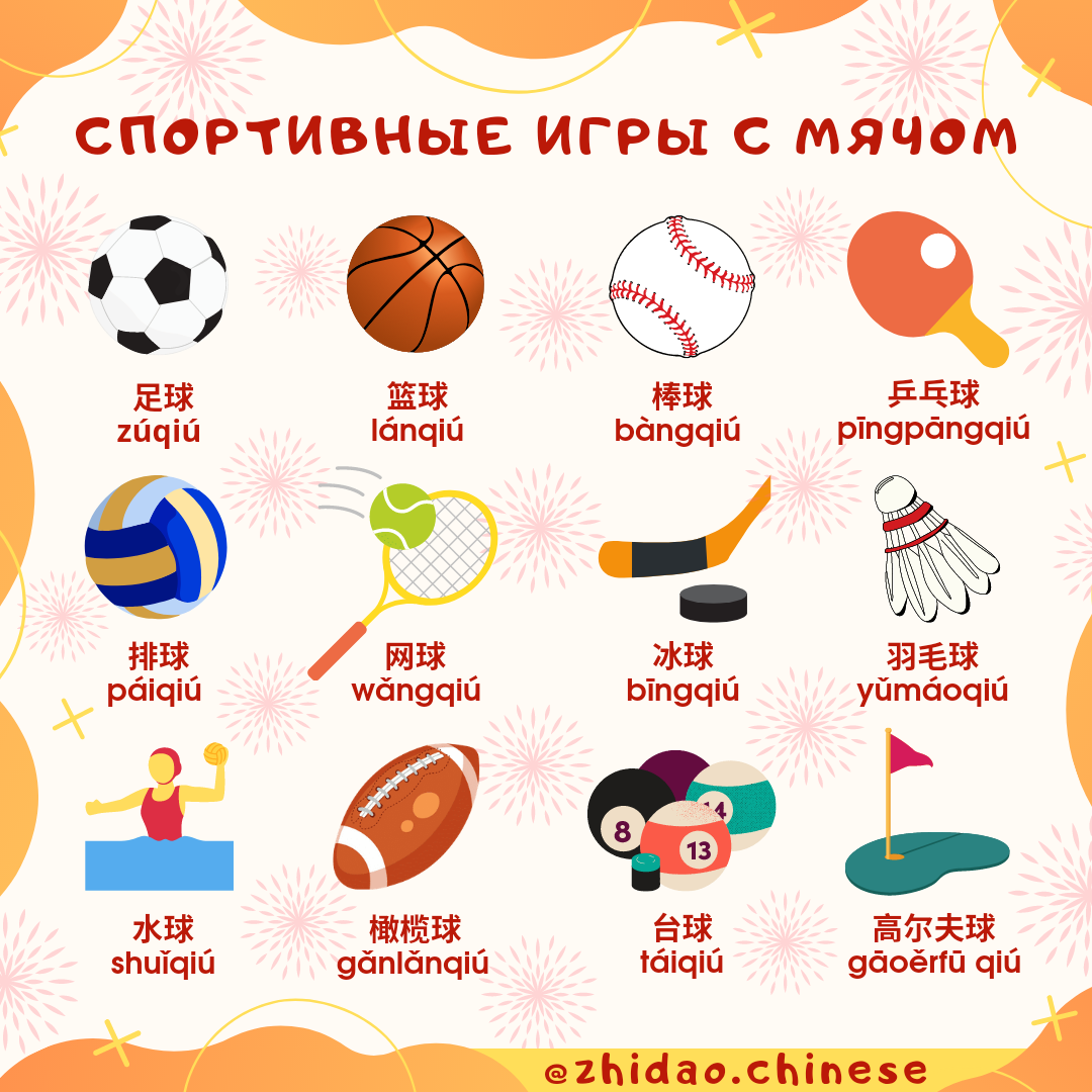 #zhidao_шпаргалки 📝 Сегодня мы подготовили для вас шпаргалку на тему "Спортивные игры с мячом" (球类运动 qiúlèi yùndòng) 🏀 🔸足球 zúqiú футбол 🔸篮球 lánqiú баскетбол 🔸棒球 bàngqiú бейсбол 🔸乒乓球 pīngpāngqiú пинг-понг; настольный теннис 🔸排球 páiqiú волейбол 🔸网球 wǎngqiú теннис 🔸冰球 bīngqiú хоккей 🔸羽毛球 yǔmáoqiú бадминтон 🔸水球 shuǐqiú спорт водное поло 🔸橄榄球 gǎnlǎnqiú регби, американский футбол 🔸台球 táiqiú бильярд 🔸高尔夫球 gāoěrfū qiú гольф 📝 Ссылка на карточки Quizlet для изучения новых слов: https://quizlet.com/_bzl68t?x=1jqt&i=2r5snr ❗В Quizlet вы можете послушать произношение всех слов! Для этого в различных режимах изучения или при просмотре списка слов нажмите на значок микрофона 🔊 📚 Хотите, чтобы Вы или Ваш ребенок заговорили на китайском? Напишите нам для записи на групповые / индивидуальные занятия! 🎓 #china #chinese #школакитайского #китайский #москва #язык #китайскиймосква #учукитайский