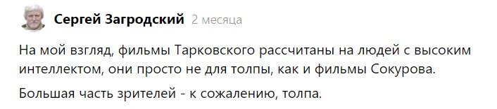 Но это не страшно, я сейчас сам постараюсь разобраться, в чем Тарковский был гениален, и почему это одновременно стало причиной его дальнейших неудач. То есть, богема считает Андрея Арсеньевича гением, но большинство зрителей - дутой фигурой от кино, "голым королем", осваивавшим бюджеты. Там писали мои читатели в комментариях.