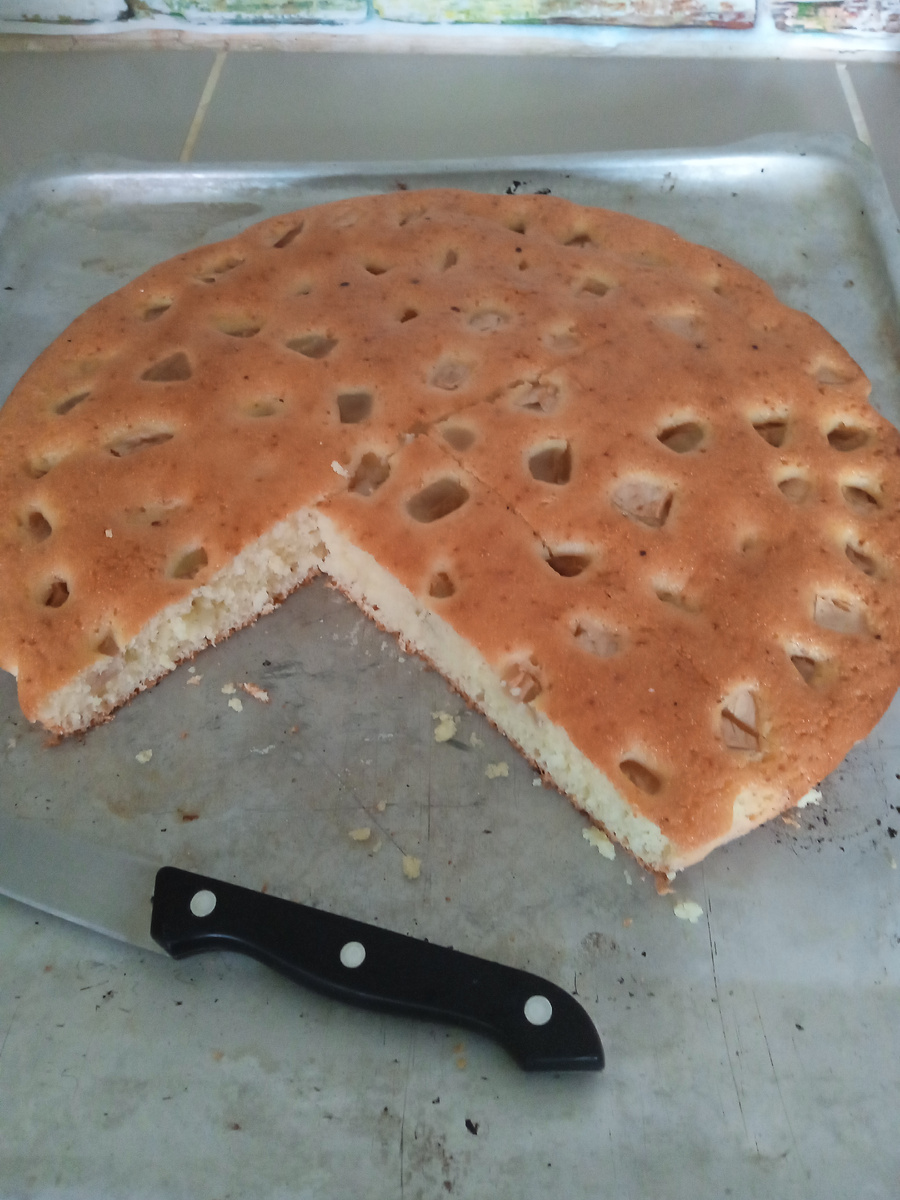 Взяла 1 ст манки 1ст кефира 1ст сахара и 2 яйца соль и всё смешала до однородного состояния. Через 10 мин включила духовку 180 с. Добавила 1 ст муки к остальным ингридиентам и 1 чл разрыхлителя. Все смешала перемешала. Взяла форму у меня самая большая 30 см постелила пергамент бумагу. В форму налила манку. И сверху на смесь разложила нарезанные произвольно яблоки. Манку отправила в духовку примерно на 50 мин. Дождалась по вверх подрумянится. И всё можно кушать. Просто. Вкусно.