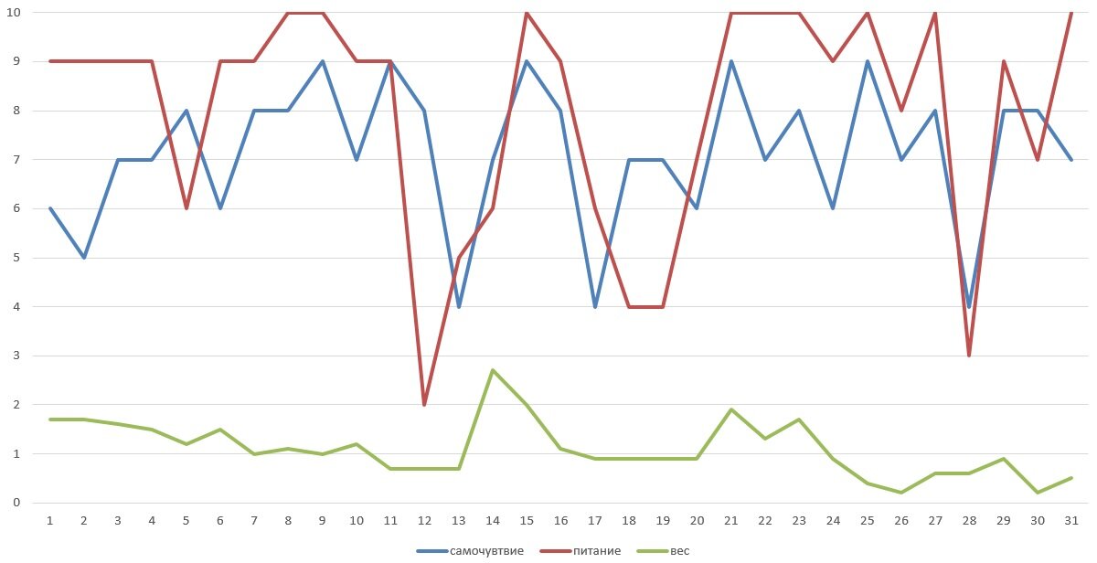 Всем привет. Я - Юля. Я похудела на 23 кг. и продолжаю свой путь к стройности. Вот и закончился мой эксперимент с наблюдением за собой в течении одного женского цикла. Итоги предыдущего эксперимента - Суть эксперимента: Наблюдение за питанием, состоянием, весом и их влиянием друг на друга в течении женского цикла. В прошлый раз я не отслеживала вес и картинка мне показалась не полной. Сейчас я каждый день оценивала своё питание и состояние по десятибалльной шкале. Оценивала сама, опираясь на свои ощущения, поэтому эксперимент необъективен от слова совсем. Зачем это вообще надо? Для понимания себя. На сколько мое питание зависит от моего состояния, зависит ли питание от состояния, зависит ли состояние от стадий женского цикла и как при всем этом меняется вес. Эксперимент не чист! Были и болезни и бессонные ночи и активные алко выходные, которые влияют вообще на всё. Что у меня получилось? Значения по весу я подогнала, чтобы можно было все пометить красиво на одном графике. 56 кг это 0,