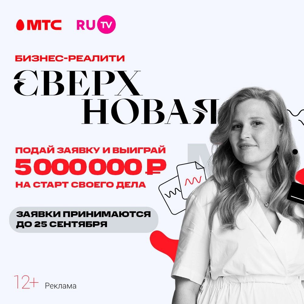 МТС и Телеканал RU.TV запускают первое бизнес-реалити для женщин СВЕРХНОВАЯ. Шоу, в котором 20 амбициозных девушек со всей России получат шанс развить свою бизнес-идею вместе с крутыми экспертами рынка и МТС. А также выиграть 5 000 000 рублей на реализацию проекта своей мечты!