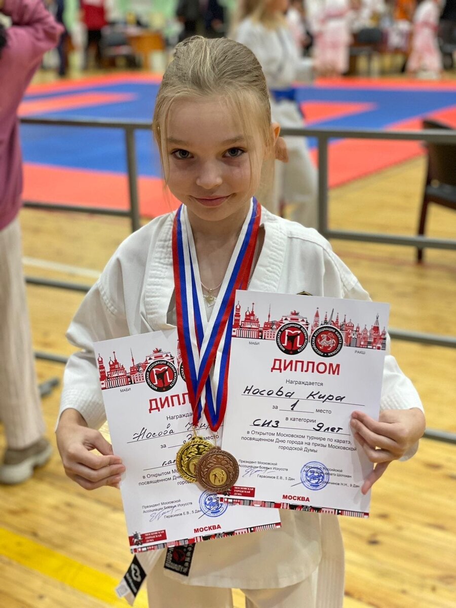 Знакомьтесь, сегодня в рубрике #Таланты1387 Кира Носова, ученица 4 «Ж» класса, каратистка, любительница вселенной Гарри Поттера и путешествий. Умница, красавица и просто хороший человек. Увлечение спортом у Киры началось в 1 классе. Направление девочка выбрала после того, как увидела показательное выступление каратистов на первой в жизни линейке. Пришла на нашу школьную секцию ОФП с элементами каратэ, где ее заметил тренер, Виталий Геннадьевич Сорокин, и втянулась! Сейчас, спустя три года, у нее синий пояс, тренировки три раза в неделю и спортивные смены в лагерях. Кстати, недавно Кира участвовала в Фестивале по всестилевому каратэ, посвященном Дню города. Там она заняла 1 и 3 места в категориях кумитэ и ката соответственно. Помимо спорта девочка увлекается английским языком и математикой. В путешествиях, которые она обожает, совершенствует свой разговорный навык. А весной прошлого учебного года Кира участвовала в Оксфордской олимпиаде от RELOD и заняла призовое место.