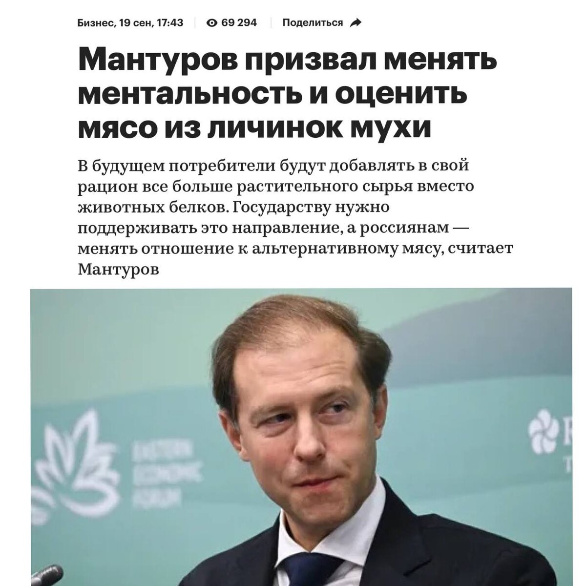 Вице-премьер и министр промышленности и торговли Денис Мантуров уверен, что производство альтернативных продуктов из растительного белка в России необходимо поддерживать, а потребителям нужно менять "ментальность" по отношению к продукту. Об этом он заявил на сессии выставки Innofood, которая проходит в Сочи. И предлагает россиянам привыкнуть к идее использовать мясо личинок мухи в своем рационе. Мантуров рассказал, сообщает Лента.ру, что, добавляя в еду белок черной львинки, некоторые страны мира, в том числе Россия, идут в ногу со временем. По его мнению, граждане могут оценить такое блюдо. "Наверное, нужно чуть-чуть поработать с ментальностью всем нам здесь присутствующим, и черная львинка может "зайти". Но нужно постараться. Хотя, наверное, ко всему человек адаптируется, и к такому тоже", - заявил Денис Мантуров Так пожелаем же Денису Мантурову самому адаптироваться к своим новшествам и уплетать за обе щеки блюда, которые сам он и продвигает, во время семейный вечеров. Мы же повес