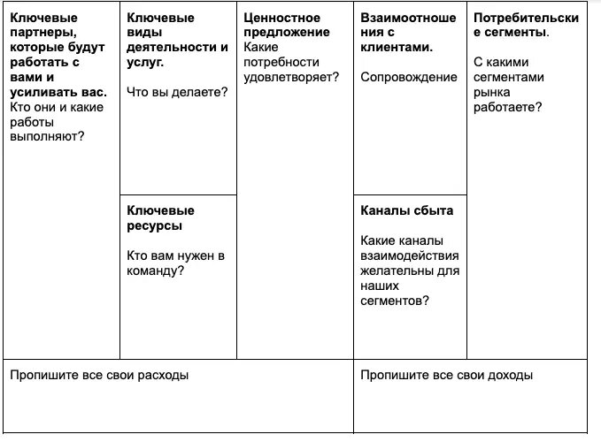 Для составления модели выпишите списком все услуги, который предлагает своим клиентам. Нарисуйте на отдельном листе шаблон бизнес-модели и напишите ответы на вопросы.