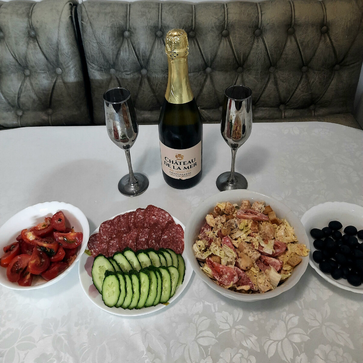 Помидоры закусочные, нарезка колбаса и огурцы, салат "Цезарь" в домашних условиях, маслины.