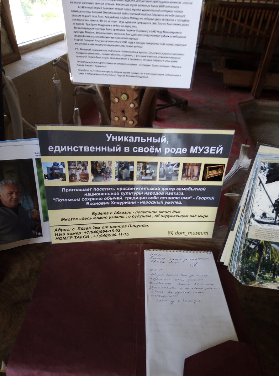 Продолжим экскурсию по уникальному музею, основателем которого является Георгий Хецуриани. Всю свою жизнь Георгий собирал предметы старины. Когда экспонатов стало много (более 2000), на домашнем совете было принято решение о постройке дома-музея. Дом строился на личные сбережения Георгия. Строительство закончилось в 1980 году и экспонаты начали занимать свои места. Дом Хецуриани в 1982 году получил официальный статус музея. В интернете и СМИ стала появляться реклама. Рекламировали свой музей и сами Хецуриани. При входе на столе лежит книга отзывов и книги, газеты, вырезки, где есть упоминания о музее. На площадке второго этажа находится камень с изречением: «Для человека с талантом и любовью к труду не существует преград». Георгий жил и трудился под этим девизом. В 1985 году торжественно открыли во дворе дома-музея мемориал памяти абхазцев, погибших в Великую Отечественную войну. Мемориал создавал Георгий вместе с сыном Зурабом. На его создание потрачено 300 тысяч рублей (в то время ав