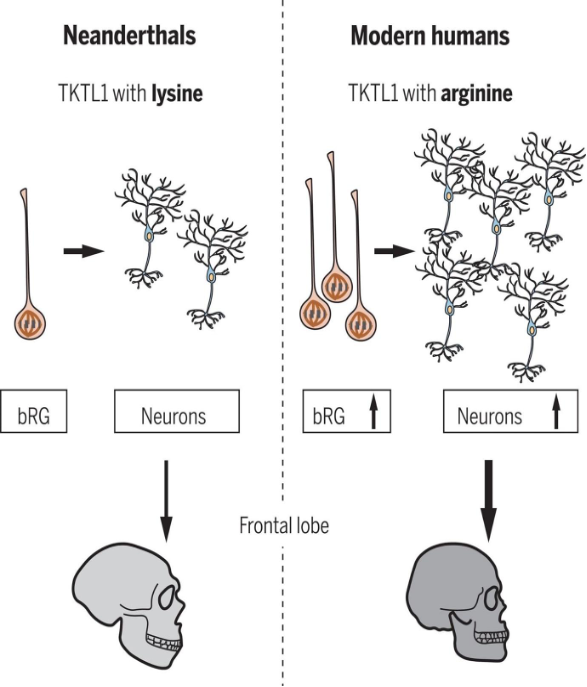 Здесь особый интерес представляют гены, влияющие на поведение клеток-предшественников нейронов в неокортексе плода, поскольку их количество и способность к размножению путем деления определяют количество будущих кортикальных нейронов. К таким генам относится TKTL1, кодирующий транскетолазо-подобный белок 1. Белок TKTL1 — один из немногих белков, структура которого отличается у современного и древнего человека. Если у обезьян и архаичных людей в структуре аминокислотной последовательности имеется лизин (форма aTKTL1), то у современного человека на его месте стоит аргинин (форма hTKTL1).