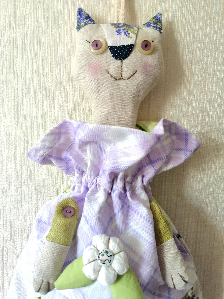 Привет всем! Незаметно год походит к концу, не успеешь оглянуться, а уже Новый год! Решила вас порадовать новым МК Кошки - пакетницы. Вот такая лавандовая она получилась. Выкройка головы кошечки и носа. Лапки Ткань для мешочка Начинаем с пошива головы. Кусочек ткани - нос, вшиваем вместе с петелькой. Нос пришиваем вручную через край. Вышиваем рот, пришиваем глаза пуговки, на ушки пришиваем треугольники ткани вручную. Щеки нарисованы фиалетовыми тенями. Прошиваем верхние и нижние лапки. Затем все детали пришиваем к мешку. Размер его может быть разный. Примерно 40 на 50 см. Верх мешка подгибаем на 2 см, подшиваем. Голову пришиваем с помощью полоски ткани, потом туда будет вставлена резинка (смотри фото выше). Лапки пришиваем на пуговки. Украшаем интересными деталями. Я выбрала цветок из ткани с рыбкой на пуговице. Всем хорошего настроения! Творчество помогает в жизни!