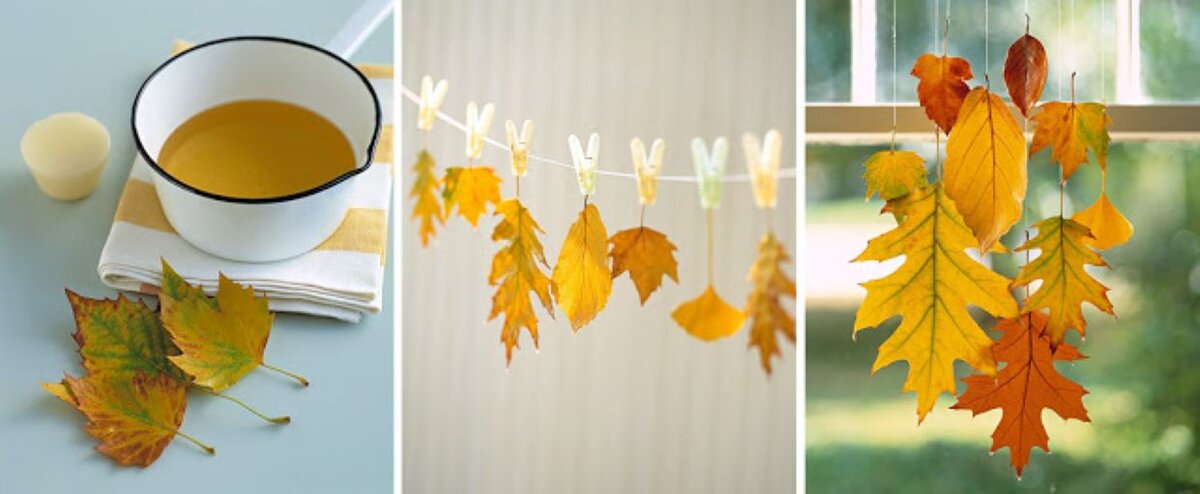 из осенних сухих листьев. Привяжите листья к ниточкам или леске. Повесьте на окно или за окно. Листья можно покрасить и обмакнуть в воск. Или сразу обмакнуть в воск.
