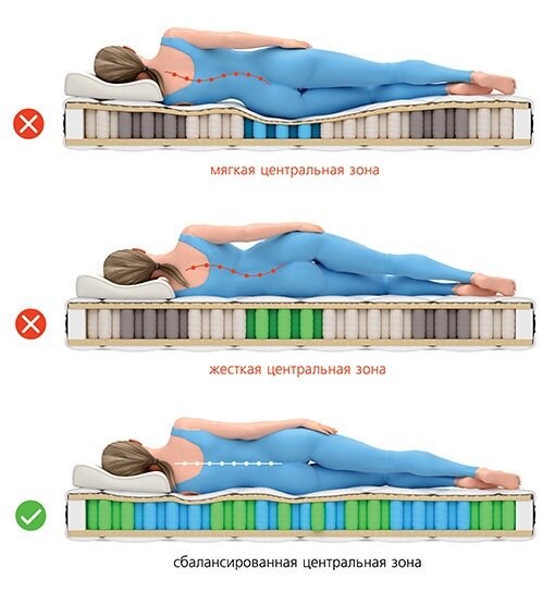 Матрасы, поверхность которых имеет различный уровень жесткости, называются зональными. Пружинные блоки, используемые для них, изготавливаются из проволоки различной толщины и обеспечивают оптимальную поддержку определенным частям тела. В беспружинных матрасах жесткость зоны зависит от вида используемого наполнителя. На такой поверхности удается сохранить горизонтальное положение позвоночника и максимально расслабиться. Для чего чередуют различные по жесткости зоны в матрасе? Тело человека устроено так, что разные его части оказывают различную нагрузку на спальную поверхность. Матрасы с одинаковым уровнем жесткости не могут обеспечить необходимую поддержку позвоночнику. В результате спящий человек не может расслабиться и получить полноценный отдых. Пружинные матрасы с зонами жесткости Зональные матрасы с основой из пружинного блока производят двух видов: 1. Зависимый пружинный блок: Получить эффект зонирования в таком блоке проблематично. Пружины в них связаны между собой, и при использ