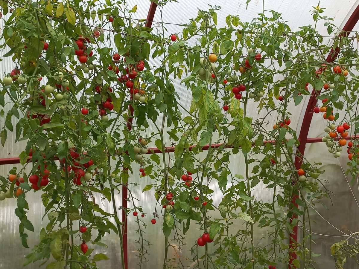 Третья декада сентября, а в теплицах всё ещё зреют помидоры. Не на всех сортах, конечно, кусты крупноплодных уже отдали всё, что могли и убраны. А вот черри и разнообразные сливки даже и не думают закругляться. В первую очередь покажу так полюбившиеся нам черри сорта Десерт от Агрофирмы Манул. В первый раз я рассказала о них в этой публикации: Затем, в течение сезона, не однократно показывала эти черри как в постах, так и в роликах, например, вот здесь: Сейчас, в конце сентября, лианы Десерта выглядят как на картинке: Урожай собираю раз в неделю и отправляю в заморозку - зимой будет с чем пожарить яичницу! Во второй теплице тяжести урожая не выдержали крепления тросиков, к которым подвязывались томаты Гибрид Тарасенко 1 и 2, а такж сорт Французский гроздевой. Кусты немного прилегли, но помидоры всё-равно как на выставке: Листья уже начали жухнуть, но помидоры выглядят аппетитно. Зелёных помидоров на Гибридах Тарасенко достаточно много, и это хорошо, потому что сажала их я отчасти из-