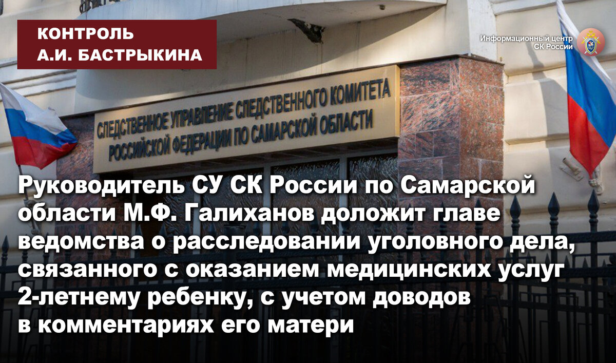 Руководитель СУ СК России по Самарской области М.Ф. Галиханов доложит главе ведомства о расследовании уголовного дела, связанного с оказанием медицинских услуг 2-летнему ребенку, с учетом доводов в комментариях его матери