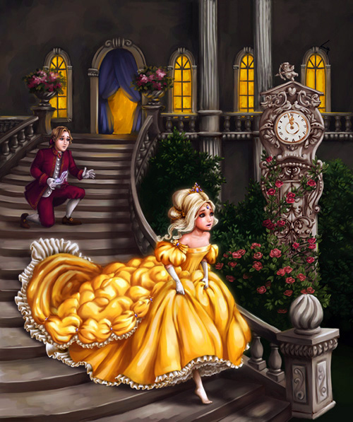 Принцу во дворце сказали, что Золушка – принцесса. Молодой человек встретил её у входа. Во дворце Золушку никто не узнал. Все гости замка замолчали, оркестр перестал играть. Все люди рассматривали Золушку, ведь она была безумно красивая и милая. А принц влюбился в неё с первого взгляда. Он позвал её танцевать. Золушка плясала лучше всех. Потом принц угостил девушку фруктами.