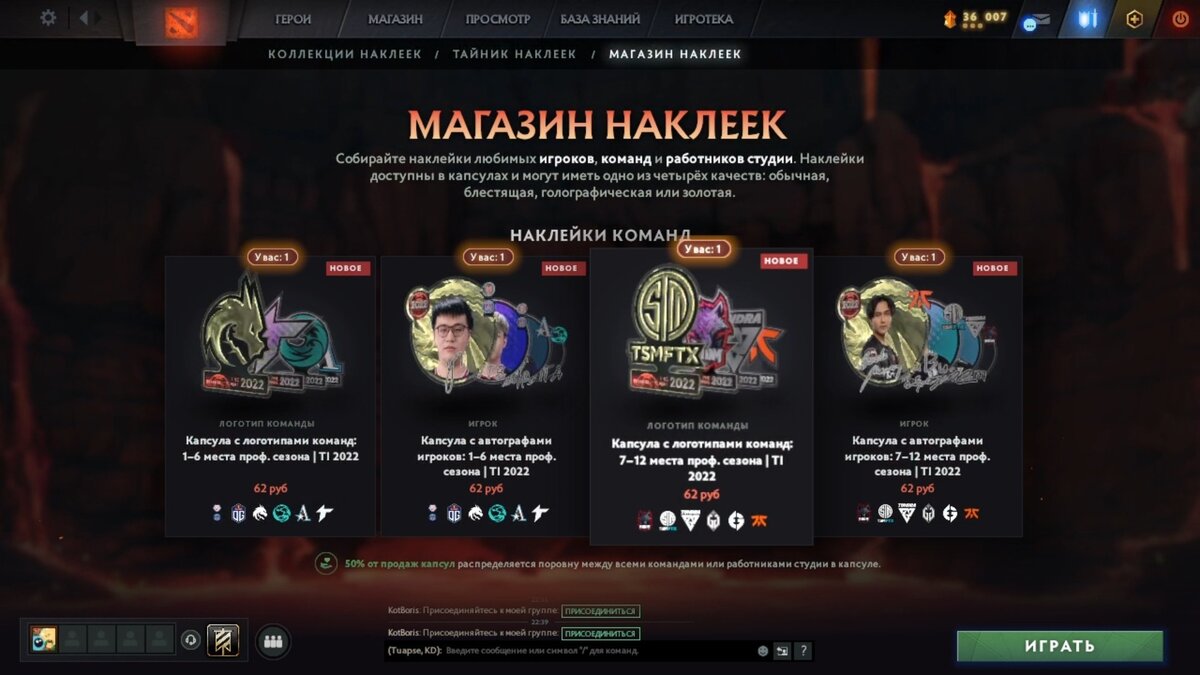 20 сентября Valve обновила Battle Pass 2022 для Dota 2, посвященный The International 11. В игре появились наклейки игроков и клубов, принимающих участие в главном турнире года. Капсулы с наклейками можно будет получить на 1, 150 и 300 уровне боевого пропуска. Владельцы Battle Pass первого уровня уже сейчас могут получить четыре капсулы (каждая по одной наклейке) — две с командами и две с игроками. Кроме того, капсулы можно купить в магазине Dota 2 или на Торговой площадке Steam. Цена в магазине составляет 62 рубля. Наклейки имеют 4 уровня редкости: обычный, блестящий, голографический и золотой. Стикеры можно будет собирать в коллекцию в специальном разделе боевого пропуска. Если собрать 1, 5, 10 или все 30 рядов, владелец получит дополнительные уровни (всего до 16 уровней) TI11 Battle Pass. Отдельные наклейки можно прикрепить к персонажам Dota 2: в таком случае они будут отображаться на экранах соперников и лучших игроков. На данный момент в игре доступны только наклейки 12 лучших ком